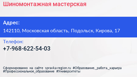 Шиномонтажная мастерская по адресу 142110, Московская область, Подольск, Кирова, 17 в дальнейшем Организация, размещена в следующих категориях: