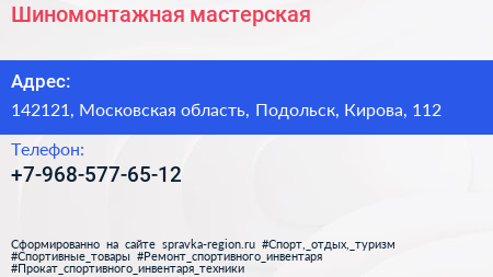 Шиномонтажная мастерская по адресу 142121, Московская область, Подольск, Кирова, 112 в дальнейшем Организация, размещена в следующих категориях: