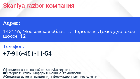Skaniya-razbor, компания по адресу 142116, Московская область, Подольск, Домодедовское шоссе, 12 в дальнейшем Организация, размещена в следующих категориях: