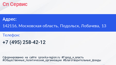 Сп-Сервис по адресу 142116, Московская область, Подольск, Лобачева, 13 в дальнейшем Организация, размещена в следующих категориях: