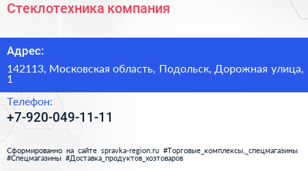 Стеклотехника, компания по адресу 142113, Московская область, Подольск, Дорожная улица, 1 в дальнейшем Организация, размещена в следующих категориях: