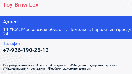 Toy-Bmw-Lex по адресу 142106, Московская область, Подольск, Гаражный проезд, 24 в дальнейшем Организация, размещена в следующих категориях: