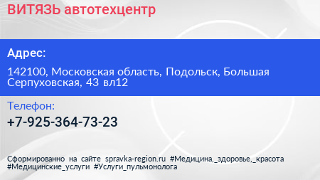ВИТЯЗЬ, автотехцентр по адресу 142100, Московская область, Подольск, Большая Серпуховская, 43 вл12 в дальнейшем Организация, размещена в следующих категориях: