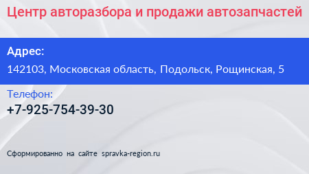 Центр авторазбора и продажи автозапчастей по адресу 142103, Московская область, Подольск, Рощинская, 5 в дальнейшем Организация, размещена в следующих категориях: