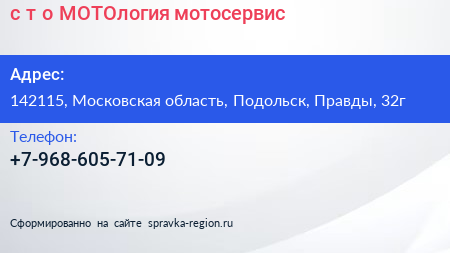 с.т.о.МОТОлогия, мотосервис по адресу 142115, Московская область, Подольск, Правды, 32г в дальнейшем Организация, размещена в следующих категориях: