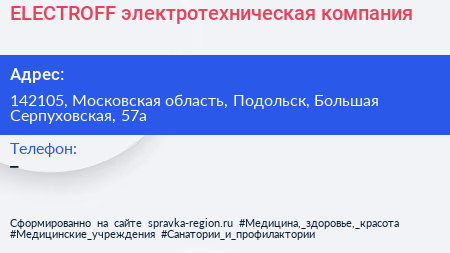 ELECTROFF, электротехническая компания по адресу 142105, Московская область, Подольск, Большая Серпуховская, 57а в дальнейшем Организация, размещена в следующих категориях: