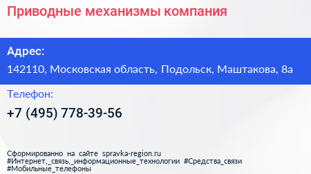 Приводные механизмы, компания по адресу 142110, Московская область, Подольск, Маштакова, 8а в дальнейшем Организация, размещена в следующих категориях: