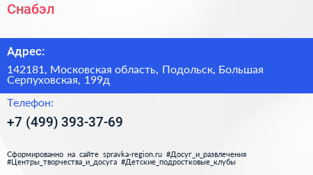 Снабэл по адресу 142181, Московская область, Подольск, Большая Серпуховская, 199д в дальнейшем Организация, размещена в следующих категориях: