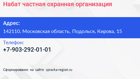 Набат, частная охранная организация по адресу 142110, Московская область, Подольск, Кирова, 15 в дальнейшем Организация, размещена в следующих категориях: