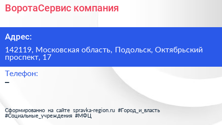 ВоротаСервис, компания по адресу 142119, Московская область, Подольск, Октябрьский проспект, 17 в дальнейшем Организация, размещена в следующих категориях: