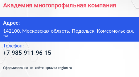 Академия, многопрофильная компания по адресу 142100, Московская область, Подольск, Комсомольская, 5а в дальнейшем Организация, размещена в следующих категориях: