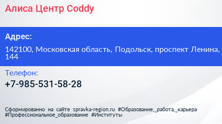 Алиса-Центр Coddy по адресу 142100, Московская область, Подольск, проспект Ленина, 144 в дальнейшем Организация, размещена в следующих категориях: