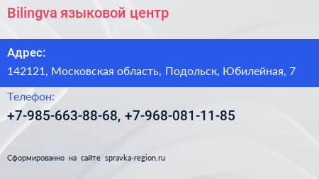 Bilingva, языковой центр по адресу 142121, Московская область, Подольск, Юбилейная, 7 в дальнейшем Организация, размещена в следующих категориях: