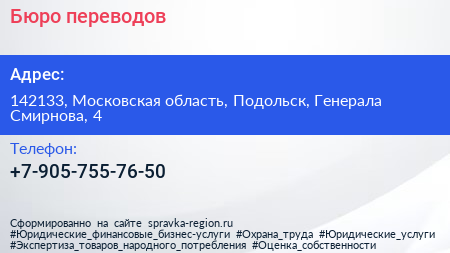 Бюро переводов по адресу 142133, Московская область, Подольск, Генерала Смирнова, 4 в дальнейшем Организация, размещена в следующих категориях: