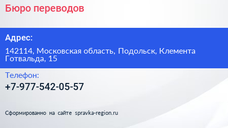 Бюро переводов по адресу 142114, Московская область, Подольск, Клемента Готвальда, 15 в дальнейшем Организация, размещена в следующих категориях: