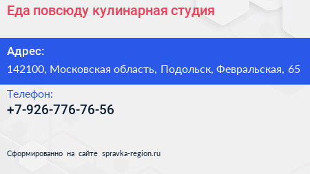 Еда повсюду, кулинарная студия по адресу 142100, Московская область, Подольск, Февральская, 65 в дальнейшем Организация, размещена в следующих категориях:
