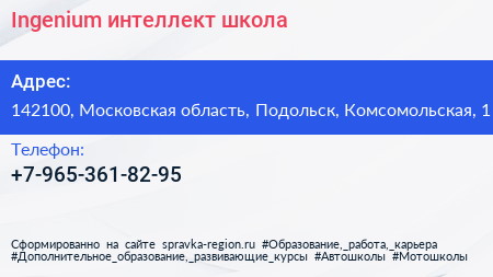 Ingenium, интеллект-школа по адресу 142100, Московская область, Подольск, Комсомольская, 1 в дальнейшем Организация, размещена в следующих категориях: