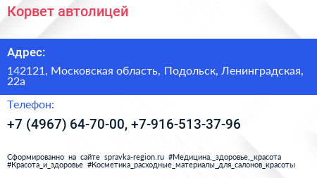 Корвет, автолицей по адресу 142121, Московская область, Подольск, Ленинградская, 22а в дальнейшем Организация, размещена в следующих категориях: