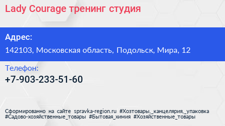 Lady Courage, тренинг-студия по адресу 142103, Московская область, Подольск, Мира, 12 в дальнейшем Организация, размещена в следующих категориях: