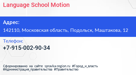 Language School Motion по адресу 142110, Московская область, Подольск, Маштакова, 12 в дальнейшем Организация, размещена в следующих категориях:
