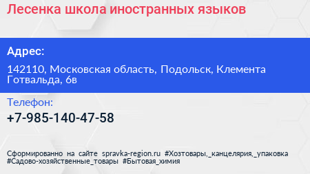 Лесенка, школа иностранных языков по адресу 142110, Московская область, Подольск, Клемента Готвальда, 6в в дальнейшем Организация, размещена в следующих категориях: