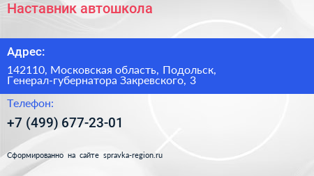 Наставник, автошкола по адресу 142110, Московская область, Подольск, Генерал-губернатора Закревского, 3 в дальнейшем Организация, размещена в следующих категориях: