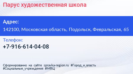 Парус, художественная школа по адресу 142100, Московская область, Подольск, Февральская, 65 в дальнейшем Организация, размещена в следующих категориях: