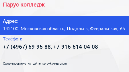 Парус, колледж по адресу 142100, Московская область, Подольск, Февральская, 65 в дальнейшем Организация, размещена в следующих категориях: