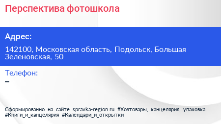 Перспектива, фотошкола по адресу 142100, Московская область, Подольск, Большая Зеленовская, 50 в дальнейшем Организация, размещена в следующих категориях:
