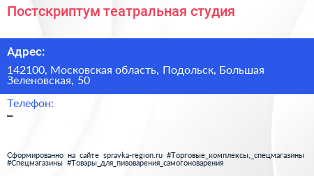 Постскриптум, театральная студия по адресу 142100, Московская область, Подольск, Большая Зеленовская, 50 в дальнейшем Организация, размещена в следующих категориях: