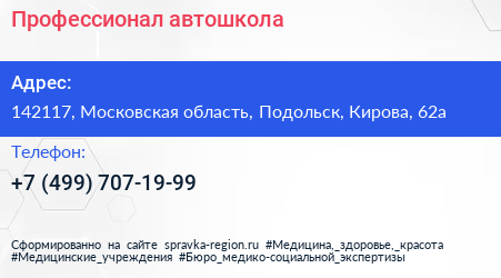 Профессионал, автошкола по адресу 142117, Московская область, Подольск, Кирова, 62а в дальнейшем Организация, размещена в следующих категориях: