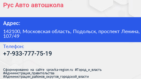 Рус-Авто, автошкола по адресу 142100, Московская область, Подольск, проспект Ленина, 107/49 в дальнейшем Организация, размещена в следующих категориях: