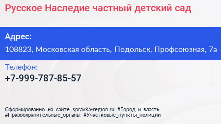 Русское Наследие, частный детский сад по адресу 108823, Московская область, Подольск, Профсоюзная, 7а в дальнейшем Организация, размещена в следующих категориях: