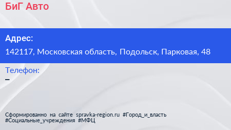 БиГ Авто по адресу 142117, Московская область, Подольск, Парковая, 48 в дальнейшем Организация, размещена в следующих категориях: