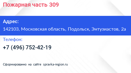 Пожарная часть №309 по адресу 142103, Московская область, Подольск, Энтузиастов, 2а в дальнейшем Организация, размещена в следующих категориях: