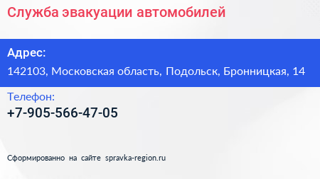 Служба эвакуации автомобилей по адресу 142103, Московская область, Подольск, Бронницкая, 14 в дальнейшем Организация, размещена в следующих категориях: