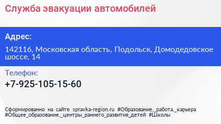 Служба эвакуации автомобилей по адресу 142116, Московская область, Подольск, Домодедовское шоссе, 14 в дальнейшем Организация, размещена в следующих категориях: