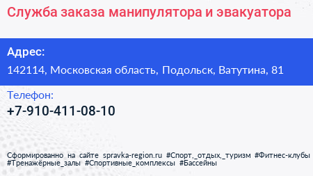 Служба заказа манипулятора и эвакуатора по адресу 142114, Московская область, Подольск, Ватутина, 81 в дальнейшем Организация, размещена в следующих категориях: