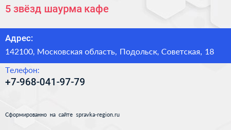 5 звёзд шаурма, кафе по адресу 142100, Московская область, Подольск, Советская, 18 в дальнейшем Организация, размещена в следующих категориях: