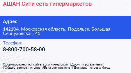 АШАН Сити, сеть гипермаркетов по адресу 142104, Московская область, Подольск, Большая Серпуховская, 45 в дальнейшем Организация, размещена в следующих категориях: