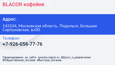BLACOR, кофейня по адресу 142104, Московская область, Подольск, Большая Серпуховская, вл30 в дальнейшем Организация, размещена в следующих категориях: