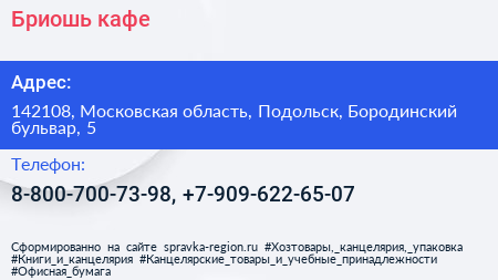 Бриошь, кафе по адресу 142108, Московская область, Подольск, Бородинский бульвар, 5 в дальнейшем Организация, размещена в следующих категориях:
