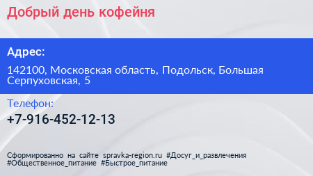 Добрый день, кофейня по адресу 142100, Московская область, Подольск, Большая Серпуховская, 5 в дальнейшем Организация, размещена в следующих категориях: