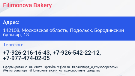 Filimonova Bakery по адресу 142108, Московская область, Подольск, Бородинский бульвар, 13 в дальнейшем Организация, размещена в следующих категориях: