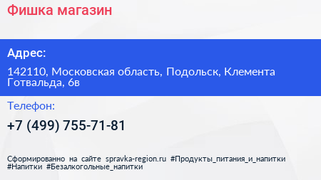 Фишка, магазин по адресу 142110, Московская область, Подольск, Клемента Готвальда, 6в в дальнейшем Организация, размещена в следующих категориях: