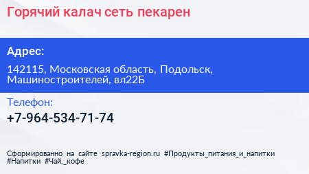Горячий калач, сеть пекарен по адресу 142115, Московская область, Подольск, Машиностроителей, вл22Б в дальнейшем Организация, размещена в следующих категориях: