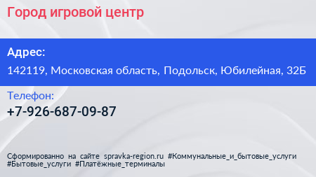 Город, игровой центр по адресу 142119, Московская область, Подольск, Юбилейная, 32Б в дальнейшем Организация, размещена в следующих категориях: