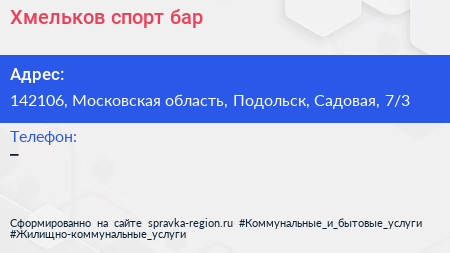 Хмельков, спорт-бар по адресу 142106, Московская область, Подольск, Садовая, 7/3 в дальнейшем Организация, размещена в следующих категориях: