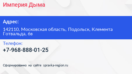 Империя Дыма по адресу 142110, Московская область, Подольск, Клемента Готвальда, 6в в дальнейшем Организация, размещена в следующих категориях: