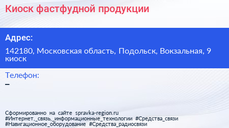 Киоск фастфудной продукции по адресу 142180, Московская область, Подольск, Вокзальная, 9 киоск в дальнейшем Организация, размещена в следующих категориях: